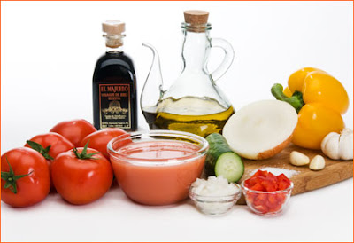 Se va poniendo en una batidora o licuadora los tomates, la cebolla, el pimiento el pepino, el vinagre, el ajo, el aceite (sin aceite no liga la mezcla) y el pan. Debe quedar fino y liquido. Se puede añadir agua si se quiere hacer más ligero.