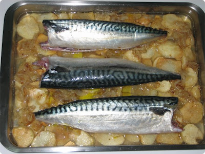 Lavar las caballas, pelar las patatas y cortarlas en rodajas gordas.